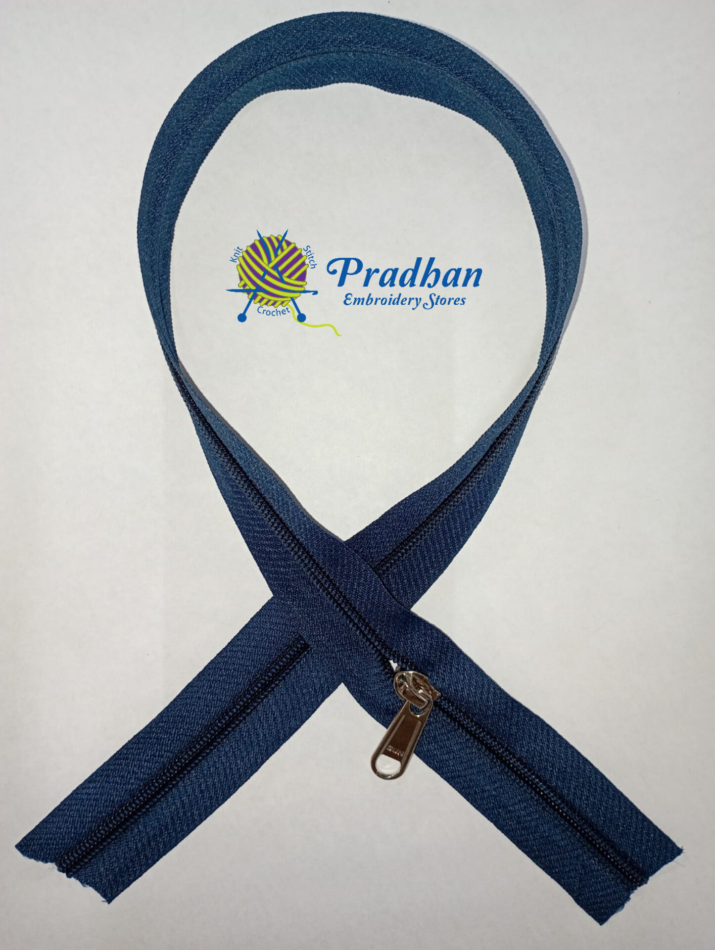 12 Inch Navy Blue Zip (Size 5) with a runner/slider attached. The 2 ends of the zip are open and not attached with any stopper. The ends of the zip are to be sewed while attaching the zip to your project, in order to avoid the runner slipping off. |