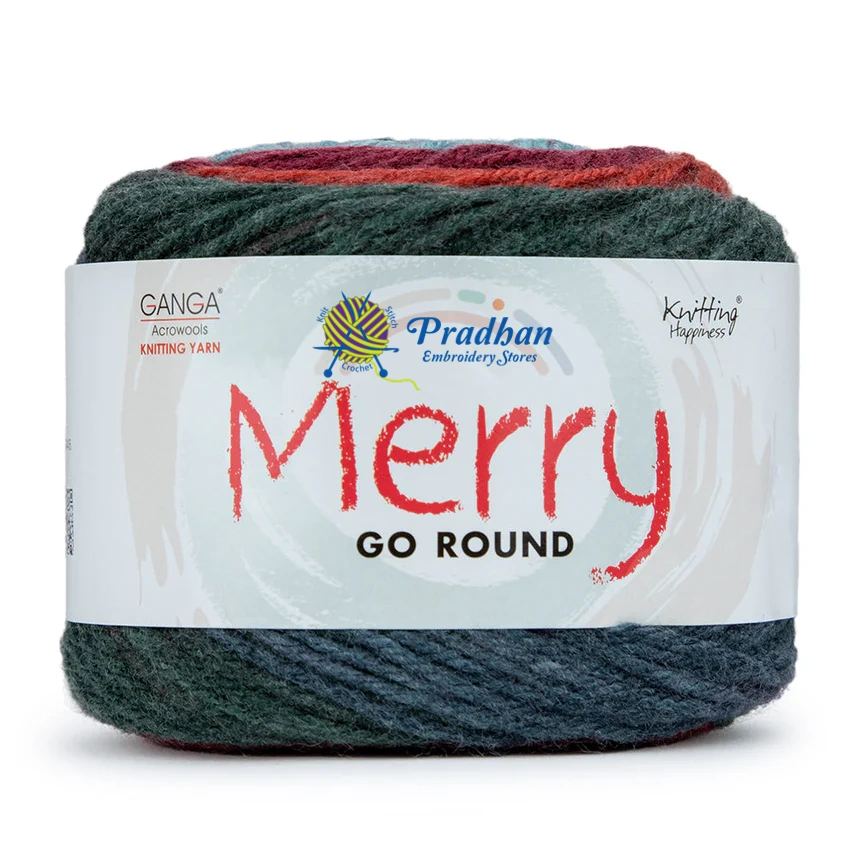 Ganga Merry Go Round is a colorful cake yarn, which has variegated and Self Striping effect. It is an Aran weight yarn and is 100% Acrylic which is ideal for both knitting and crocheting. · Ball weight in grams: 100 g per ball · Count: Nm 6.3/4 · Length: 157 m · Blend: 100% Acrylic · Needle Size: UK 4(6 mm) · Crochet Size: UK 3(6.5 mm) · Needle Stitch Info: 21 rows 15 stitches · Crochet Stitch Info: 15 rows 13 stitches · Yarn Weight: 4 Medium You make also like similar thickness multicolor yarn in 100gm balls Ganga PINTO |